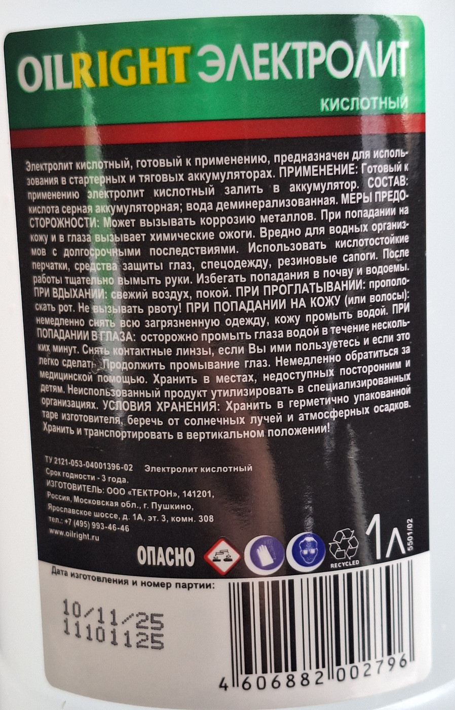222_ Электролит OILRIGHT 1 л плотность 1.28 ш/к 4606882002796