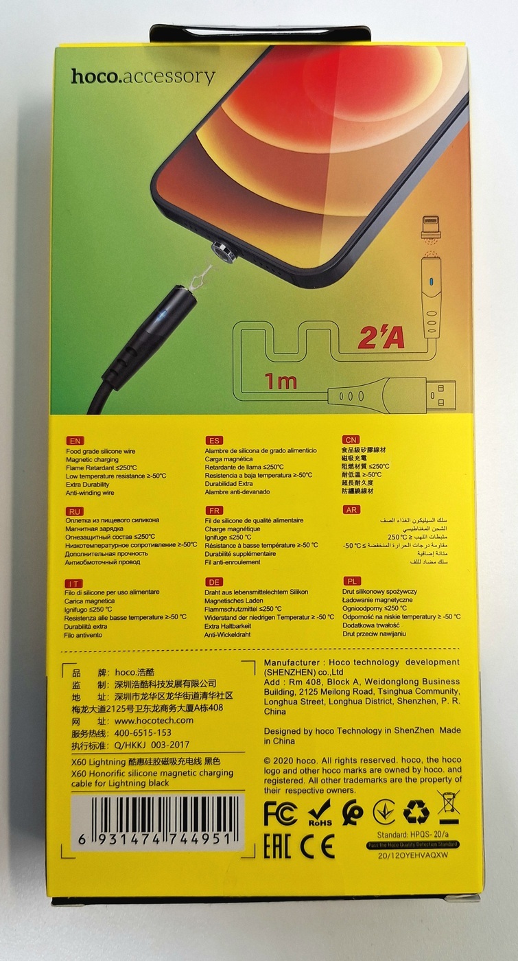 372_ Кабель USB - Lightning HOCO X60, 2A (черный) 1м (силиконовый, магнитный) ш/к 6931474744951